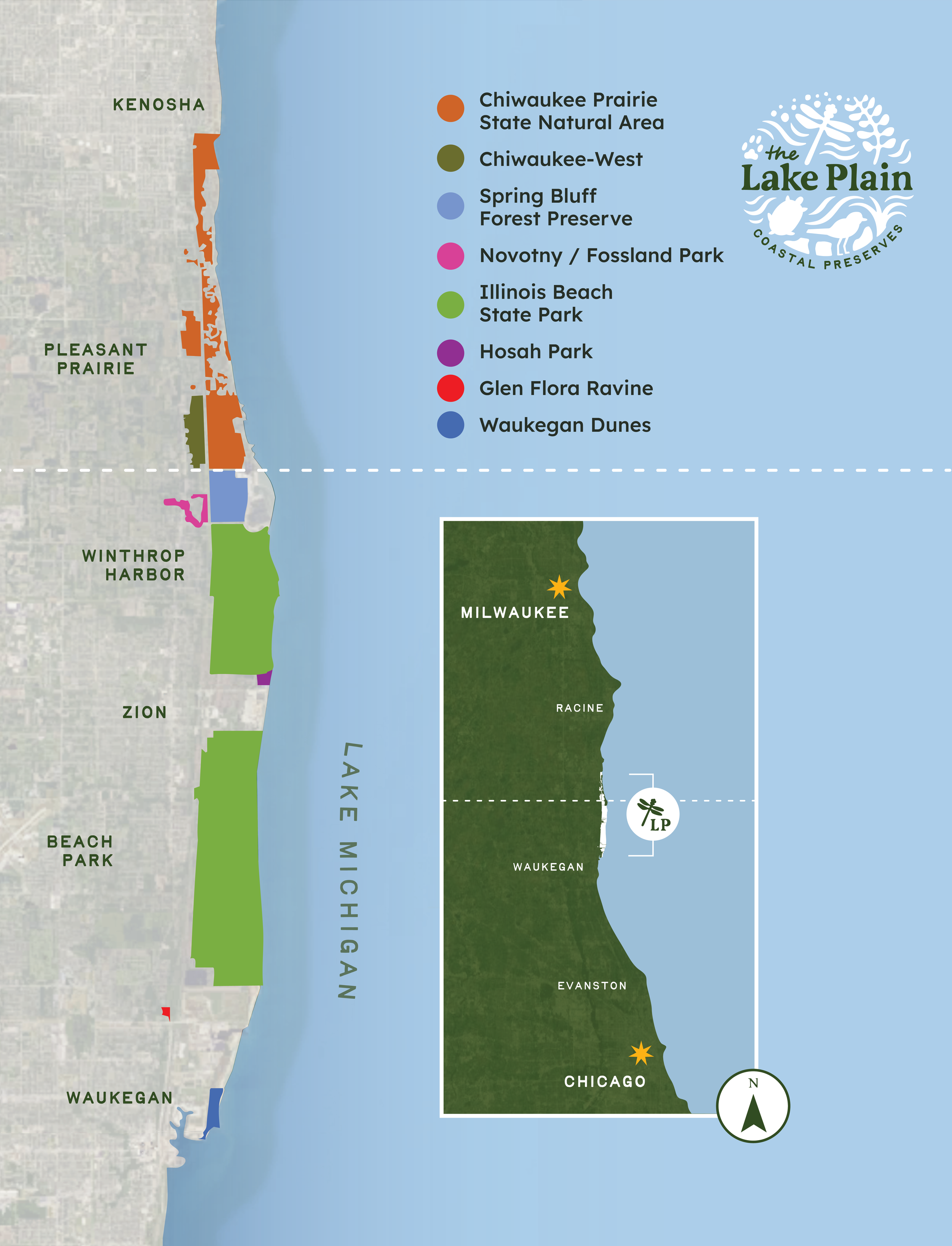 The Lake Plain Coalition began as a grant-funded planning initiative in 2006. The Coalition was formally established in 2010 with a memorandum of understanding (MOU) between Lake County Forest Preserves, The Nature Conservancy, The Illinois Department of Natural Resources, the Wisconsin Department of Natural Resources, The Village of Pleasant Prairie, University of Wisconsin-Parkside, and the Chiwaukee Prairie Preservation Fund, as a concerted effort to protect and manage the region’s unique and high-quality natural features, now known as The Lake Plain Coastal Preserves.