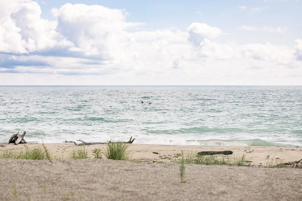 The dynamic shoreline where Lake Michigan meets land, constantly reshaping the coast through wave action, wind, and seasonal ice.